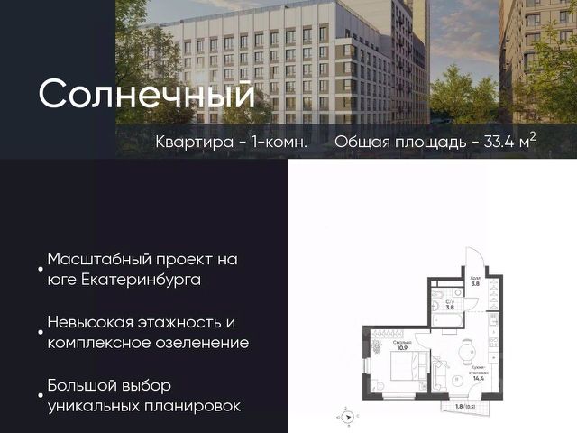 Продается квартира 200, по адресу Свердловская область, г. Екатеринбург, ул. Чемпионов, корпус Солнечный, блок 11.1 в Солнечный на 2 этаже, с площадью 33.4 м2.