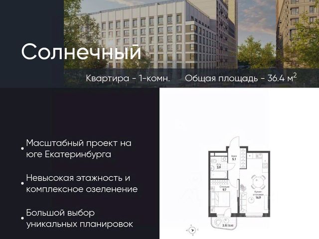 Арт. 81616361. В продаже уникальная однокомнатная квартира в ЖК Небосклоны. По такой цене у застройщика больше нет. Квартира с окнами на юг, видовая - из окон открывается шикарный вид на Уктусские горы и лес. Жилой комплекс класса комфорт+ . Собственный сад двор с детскими и спортивными площадками. Подземный паркинг (место могу помочь приобрести). Собственая котельная, что существенно сократит расходы на коммунальные платежи. Близится сдача дома, прирост цены для такого класса жилья очевиден. Подойдет как для проживания, так и для сдачи в аренду.