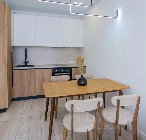 Чистовая отделка квартиры под ключ: ламинат (32 класса), плотные качественные обои под покраску, натяжной потолок, межкомнатные двери с фурнитурой; в санузле: сантехника (раковина, унитаз, без ванны), плитка на полу, водоэмульсионная краска на стенах.