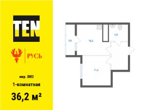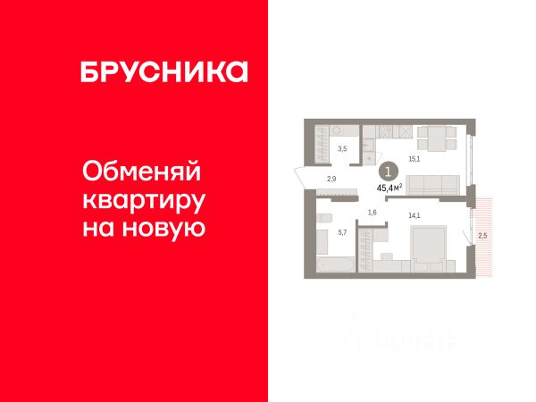 Квартира с кухней-гостиной и одной спальней в квартале "Траектория". Особенности планировки: балкон, вид во двор, предчистовая отделка.