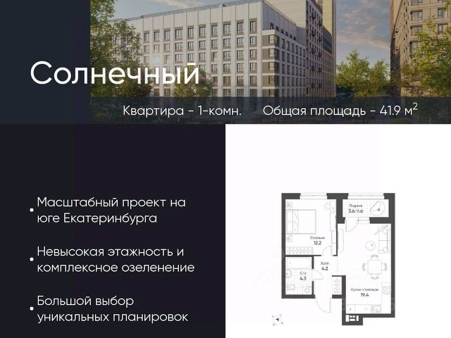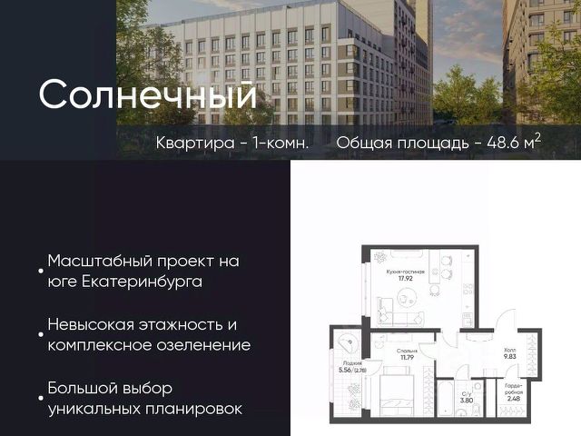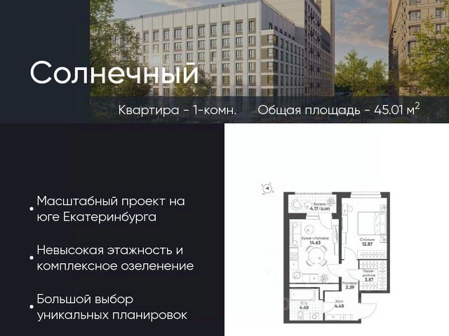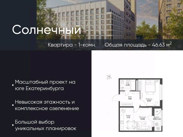 Продается просторная 1-к.квартира 46,6 м2 в формате евро-2, прекрасно подходит для молодой семьи. Квартира находится в современном районе Солнечный в кирпичном доме комфорт-класса, застройщик Брусника. Дом теплый с хорошей шумоизоляцией. Квартира угловая, светлая, видовая с функциональной планировкой: удобно разделена зона кухни и гостиной, вместительная спальня с шикарным видом в две стороны в четыре окна. В прихожей ниша под гардероб, большой сан. узел в кафеле. С 10-го этажа открывается вид на современный Парк Солнечный, в окружении которого развита сеть пеших маршрутов, а также обширные зоны для отдыха и активностей. Зимой работает большой открытый каток. Сидя за чашкой чая можно наслаждаться закатом или праздничным салютом. Вход в подъезд со стороны парка, подъезд с прозрачными входами, оформлен в стильном дизайне, подчёркивающем статус вашего нового жилья. Двор закрытый с выходом на 3 стороны, территория двора светлая ландшафтная с зонами для спорта, отдыха, детских площадок. Продуманное озеленение из кустов с учетом календаря цветения, таким образом во дворе всегда будет сад. Детская зона из экологичных материалов. Для спорта: зона воркаута, пинг-понга, корт. Разноуровневое освещение, подсветки. Видеонаблюдение на всей территории жилого комплекса. Рядом с домом наземная парковка со шлагбаумом. В районе действуют три государственных и два частный детских сада, школа Созвездие, Губернаторский лицей. Для спорта ледовая арена Авто, Центр художественной гимнастики. Расположены многочисленные магазины, супермаркеты, кофейни и рестораны. В 1,5 км от дома расположен торговый центр Аутлет-центр Brаnds`Stories. Прямо в доме есть медицинский центр Мира. Удобная транспортная доступность до улицы Московской в сторону центра 6 км, удобный выезд на ЕКАД, до ближайшей станции метро Ботаническая или Чкаловская 15-20 минут на автомобиле, на трамвае 30 минут. Остановка городского транспорта в разные районы города прямо напротив дома. Один взрослый собственник, обременений нет. Рассматриваем обмен на студию в этом районе от застройщика Брусника. Помощь в одобрении ипотеки. Звоните, записывайтесь на просмотр! ID объекта в нашей базе: 1983