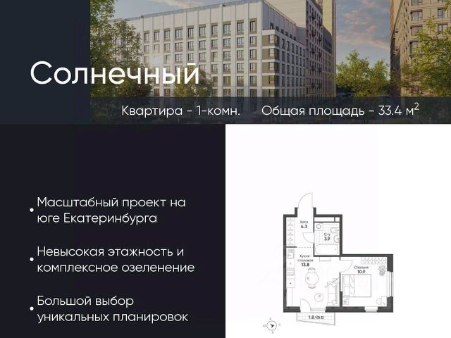 Продается квартира 516, по адресу Свердловская область, г. Екатеринбург, ул. Чемпионов, корпус Солнечный, блок 11.1 в Солнечный на 10 этаже, с площадью 33.6 м2.