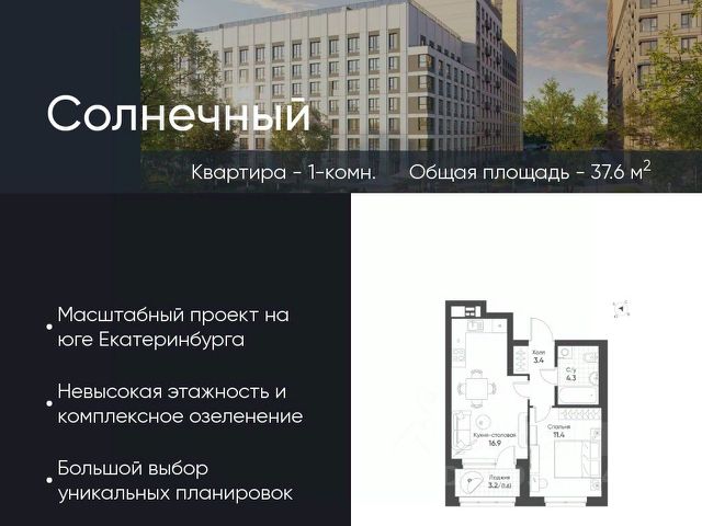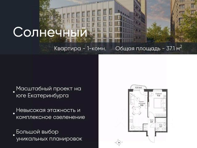 Продается квартира 119, по адресу Свердловская область, г. Екатеринбург, ул. Чемпионов, корпус Солнечный, блок 11.1 в Солнечный на 10 этаже, с площадью 37.1 м2.