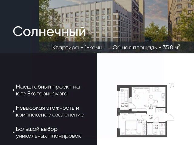 Продается квартира 146, по адресу Свердловская обл., г. Екатеринбург, ул. Счастливая, корпус Солнечный, блок 11.2 в Солнечный на 10 этаже, с площадью 39.3 м2.