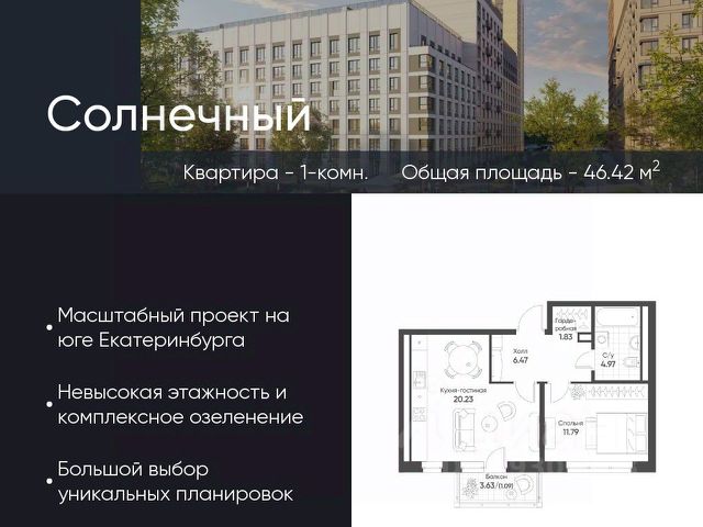 Продается квартира 93, по адресу Свердловская обл., г. Екатеринбург, Чкаловский район, корпус Солнечный, корпус 6.2 в Солнечный на 11 этаже, с площадью 44.46 м2.
