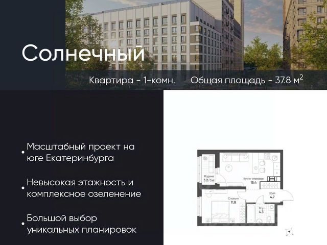Продается квартира 125, по адресу Свердловская обл., г. Екатеринбург, Чкаловский район, корпус Солнечный, блок 6.3 в Солнечный на 11 этаже, с площадью 33.9 м2.