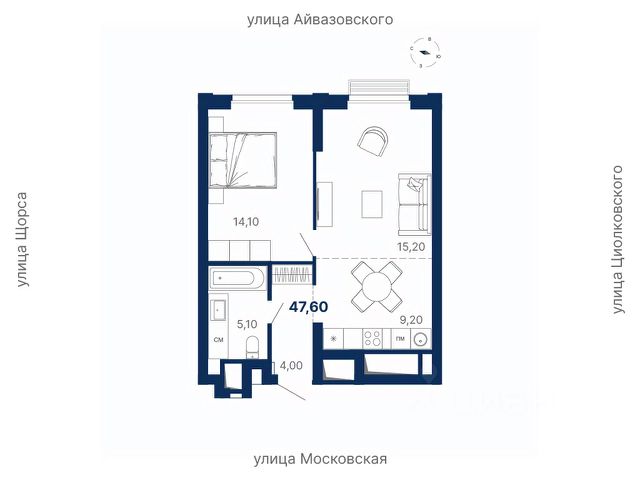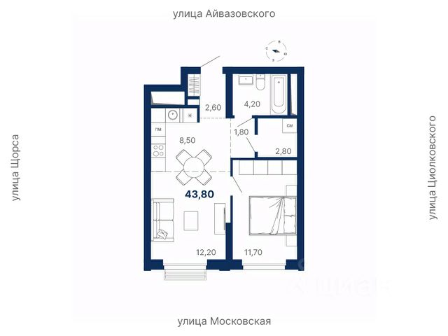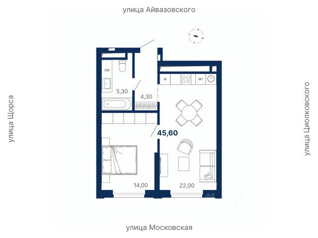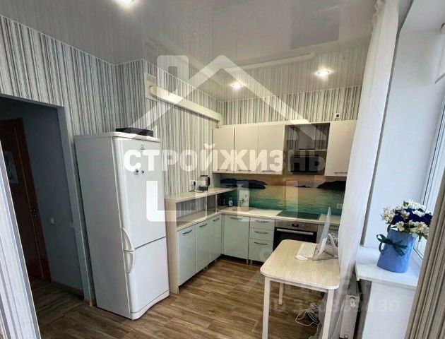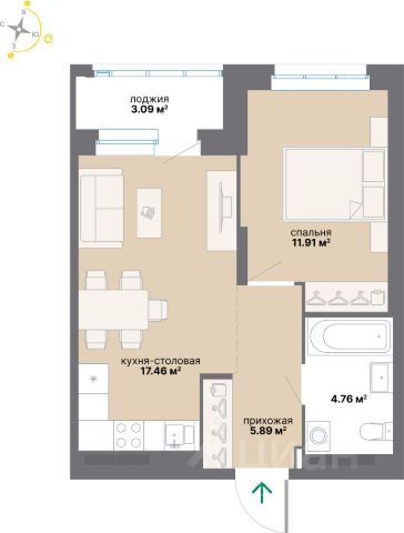 По сути это евродвушка: Кухня-гостиная - 23 кв.м., и спальня - 9 кв.м., большая лоджия 7 кв.м., совмещённые ванная и туалет. При входе большая прихожая, где разместился встроенный шкаф-гардеробная, которые остаются вам в подарок.