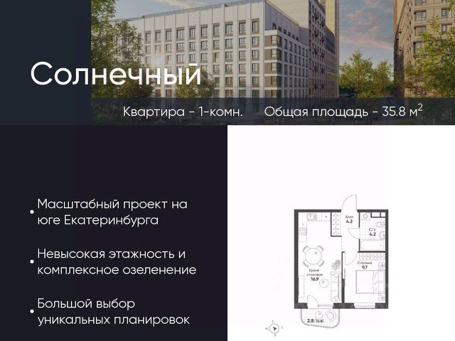 Продается квартира 546, по адресу Свердловская область, г. Екатеринбург, ул. Чемпионов, корпус Солнечный, блок 11.1 в Солнечный на 12 этаже, с площадью 35.8 м2.