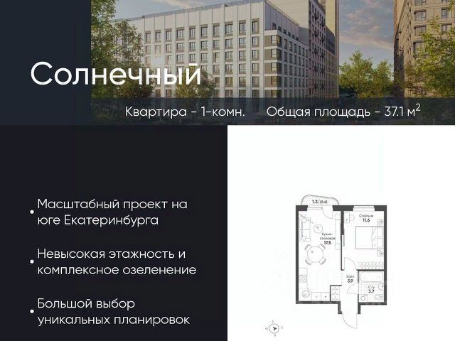 Продается квартира 147, по адресу Свердловская область, г. Екатеринбург, ул. Чемпионов, корпус Солнечный, блок 11.1 в Солнечный на 12 этаже, с площадью 37.1 м2.