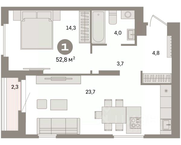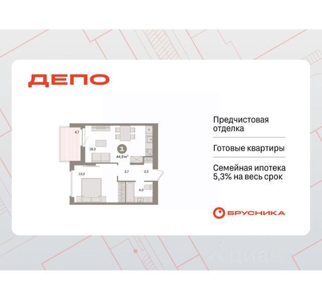 Квартира с кухней-гостиной и одной спальней в квартале "Депо". Особенности планировки: лоджия, предчистовая отделка. квартиры в нашей базе: ДЕП07-Ж1.13.3. Квартал "Депо" расположен в активно развивающейся части Сортировки, на месте, где раньше был завод "Электротранс". Преимущества Сортировки — развитая инфраструктура. В пешей доступности — супермаркеты, остановки городского транспорта, поликлиники, детские сады, школы, гимназии, торговые центры, автоцентры, рынок с большим и доступным по стоимости выбором товаров, парк РЖД и парк с аттракционами Таганская Слобода. Квартал "Депо" расположен в границах улиц Пехотинцев — Таватуйская — Сортировочная — Новая (проектируется). Благоустройство квартала основано на трёх принципах. Первый — особое внимание к воде. Архитекторы Брусники создадут внутри застройки систему дождевых садов, которые будут фильтровать сток (в том числе с крыш зданий) и снижать нагрузку на ливневую канализацию . Второй принцип — разнообразие. Мы высадим на улицах ивы, липы, яблони разных сортов, спиреи, лапчатку и дерен, а во дворах — березы, липы, черёмухи, пузыреплодник, кизильник и манчжурский орех, который в Екатеринбурге почти не представлен. Третий принцип — зонирование. Центральный бульвар мы насытим площадками для игр детей и спокойного отдыха взрослых, на площади перед детским садом расположим окруженные деревьями плэйхабы, летние веранды кафе, открытое пространство с запоминающимся артом. #z5C6dc