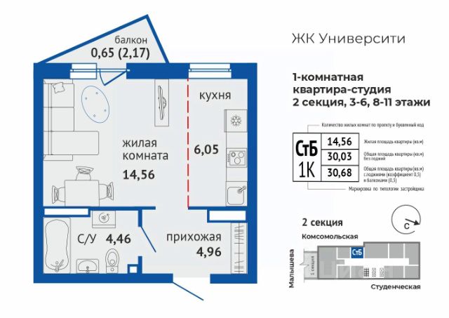 Продаётся 1-комнатная квартира в строящемся доме (Дом 1), срок сдачи: I-кв. 2028, общей площадью 30.68 кв.м., на 8 этаже. Новый жилой комплекс "Университи" от застройщика "Правобережный" расположен по адресу: г. Екатеринбург, Студенческая улица.