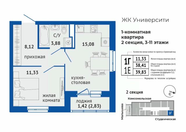 Продаётся 1-комнатная квартира в строящемся доме (Дом 1), срок сдачи: I-кв. 2028, общей площадью 39.83 кв.м., на 8 этаже. Новый жилой комплекс "Университи" от застройщика "Правобережный" расположен по адресу: г. Екатеринбург, Студенческая улица.