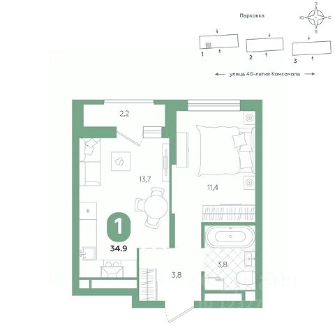 Квартира располагается в ЖК "Комсомольский" — жилом комплексе комфорт-класса. Здесь вы будете наслаждаться беззаботной жизнью, ведь ваш дом — воплощение практичности, безопасности и надежности. Для удобства предусмотрены колясочные на первых этажах домов, где можно оставить велосипеды и коляски в тепле. За безопасность отвечают система электронных ключей и видеонаблюдение. Еще здесь собственная котельная, поэтому в доме всегда будут горячая вода и оплата счетов только за фактически потребленное тепло.