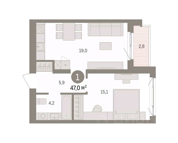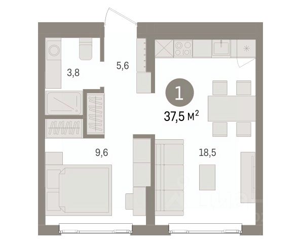 Квартира с кухней-гостиной и одной спальней в квартале "Траектория". Особенности планировки: гардеробная, вид во двор, предчистовая отделка, балкон.
