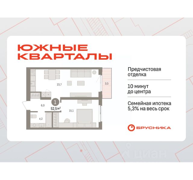 Квартира с кухней-гостиной и одной спальней в Южных кварталах. Особенности планировки: предчистовая отделка, балкон. квартиры в нашей базе: ЮК04-А1-9-9.9.10. Жилой район "Южные кварталы" расположен в границах улиц Московская, Шаумяна и Фурманова, недалеко от автовокзала. До центра города — 10 минут на автомобиле. До станции метро "Чкаловская" — 15 минут пешком. Рядом находится парк, школа олимпийского резерва, несколько гимназий, лицей, детские сады и городская больница. "Южные кварталы" — проект комплексного редевелопмента территории, разработанный архитекторами Брусники совместно с голландскими бюро. Он разделен на несколько частей, каждая из которых имеет свой характер. Вдоль оживленной Московской появятся более высокие и крупные дома. Профиль спокойной и очень зелёной Шаумяна сформируют кварталы среднеи этажности. В глубине района мы расположим урбан-виллы, чуть дальше — башни-доминанты. Последние будут играть роль визуальных акцентов и впоследствии станут символами этого места. Ближе к Фурманова мы организуем образовательный кластер. Его составят два детских сада на 300 и 325 мест и школа, рассчитанная на 1500 учеников. Школа будет иметь спортивную зону, которая станет доступна и жителям района. Свяжет территорию сеть общественных пространств. Её центральным звеном станет зелёный променад, проходящий сквозь весь район и соединяющий его с парком 50-летия ВЛКСМ. #ZmU0W1