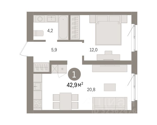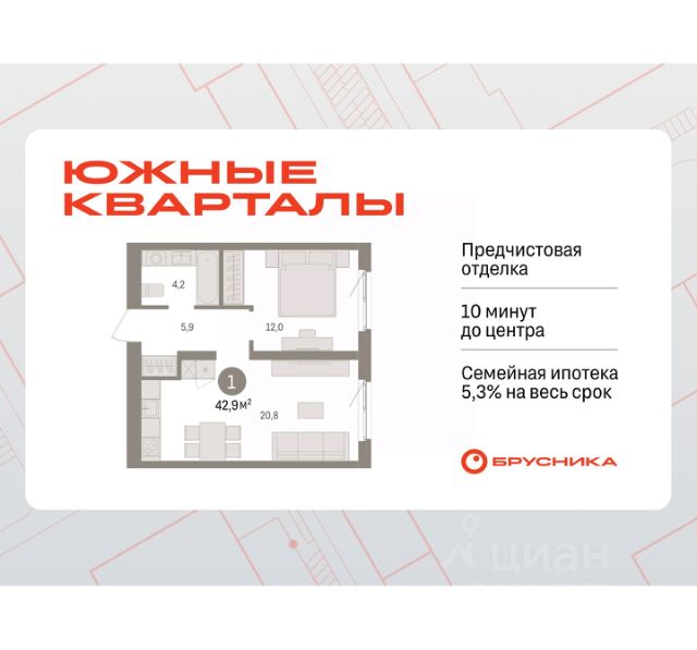 Квартира с кухней-гостиной и одной спальней в Южных кварталах. Особенности планировки: предчистовая отделка, балкон. квартиры в нашей базе: ЮК04-А1-9-9.9.10. Жилой район "Южные кварталы" расположен в границах улиц Московская, Шаумяна и Фурманова, недалеко от автовокзала. До центра города — 10 минут на автомобиле. До станции метро "Чкаловская" — 15 минут пешком. Рядом находится парк, школа олимпийского резерва, несколько гимназий, лицей, детские сады и городская больница. "Южные кварталы" — проект комплексного редевелопмента территории, разработанный архитекторами Брусники совместно с голландскими бюро. Он разделен на несколько частей, каждая из которых имеет свой характер. Вдоль оживленной Московской появятся более высокие и крупные дома. Профиль спокойной и очень зелёной Шаумяна сформируют кварталы среднеи этажности. В глубине района мы расположим урбан-виллы, чуть дальше — башни-доминанты. Последние будут играть роль визуальных акцентов и впоследствии станут символами этого места. Ближе к Фурманова мы организуем образовательный кластер. Его составят два детских сада на 300 и 325 мест и школа, рассчитанная на 1500 учеников. Школа будет иметь спортивную зону, которая станет доступна и жителям района. Свяжет территорию сеть общественных пространств. Её центральным звеном станет зелёный променад, проходящий сквозь весь район и соединяющий его с парком 50-летия ВЛКСМ. #ZmU0W1
