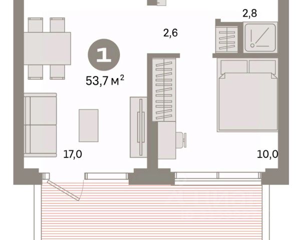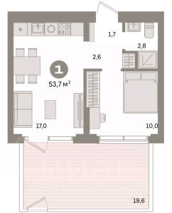 Квартира с кухней-гостиной и одной спальней в квартале "Траектория". Особенности планировки: балкон, вид во двор, предчистовая отделка.