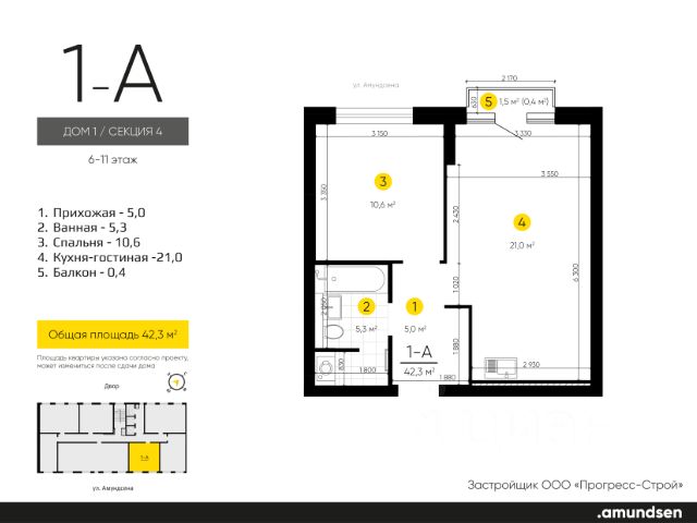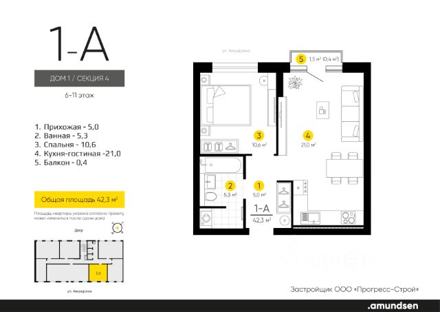 Жилой квартал "Amundsen" - для себя, для семьи, для жизни и развития. Авторская концепция проекта эффектно выделяется в 3 особенностях комплекса: фасады, двор и места общего пользования. AMUNDSEN ПРОЕКТ С ХАРАКТЕРОМ ВЕЛИКОГО ПЕРВООТКРЫВАТЕЛЯ. 4 СЕЗОНА: Двор-трансформер позволяет активно использовать все площадки круглый год. В холодное время года санки, коньки и снежные бои за главную башню. В теплое время источник наполняет двор водой и прохладой. Работают площадки для активных игр и спокойного отдыха. 6 ДЕТСКИХ ПЛОЩАДОК: Мы разделили площадки по возрастным группам для малышей и детей постарше. Качели, аттракционы, водные и активные игры созданы, чтобы познавать мир. 5 ПЛОЩАДОК ДЛЯ СПОКОЙНОГО ОТДЫХА: За счет игры с ландшафтом мы создали приватные зоны, украсили пространство разнотравьем, оживили двор источником. Шум воды, лежаки, беседки, парк места, где ты почувствуешь течение жизни. AMUNDSEN ИДЕАЛЬНОЕ МЕСТО ДЛЯ ЖИЗНИ И РАЗВИТИЯ. - Жилой квартал расположен в экологически чистом районе в окружении двух лесных массивов. - Новые современные школы и детские сады. Спортивный кластер для занятий. - Главный холл пространство для всех. Для самых маленьких игры, для взрослых кафе с ярким дизайном, тихий коворкинг, места для отдыха и светлый, просторный атриум. - Детские площадки "будущего" с оригинальным подходом к созданию игровой среды. - Безопасная территория. Круглосуточная охрана, видеонаблюдение 24/7, электронная система доступа, двор без машин. Застройщик ООО СЗ "Прогресс-Строй", проектная декларация на сайте наш.дом.рф