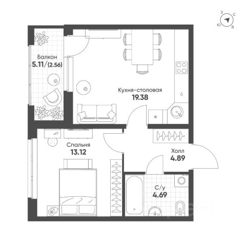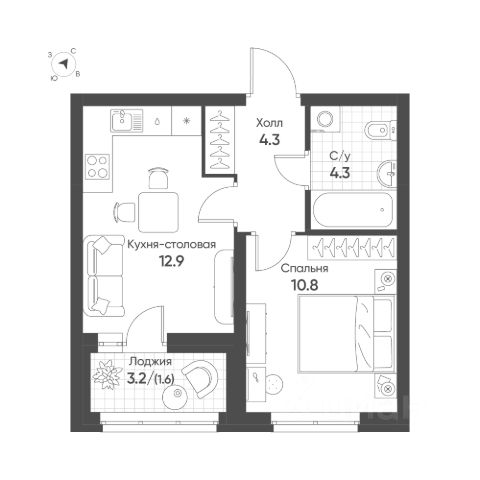 * Удобная планировка: кухня-гостиная 15,3 кв.м и комната 10,2 кв.м.