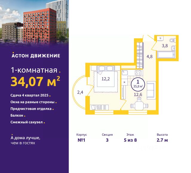 1-комнатная квартира от застройщика в 4-х-этажном кирпичном доме.