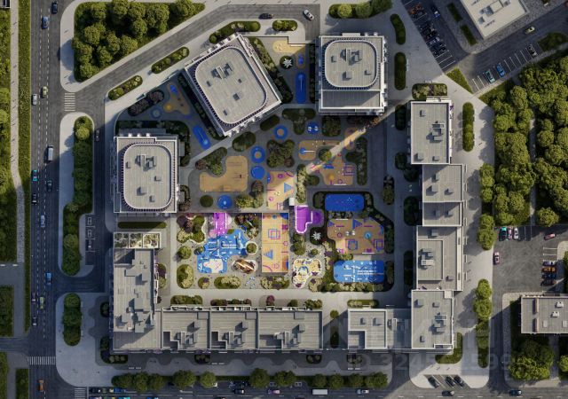 Двор без машин. Игровые площадки для детей разных возрастов, места отдыха и занятий спортом для взрослых не соседствуют с парковкой.