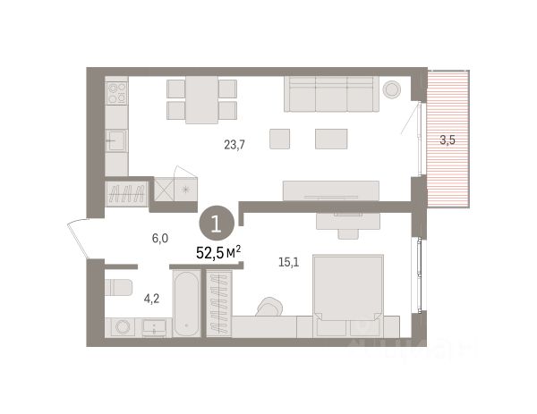 Квартира с кухней-гостиной и одной спальней в квартале "Траектория". Особенности планировки: балкон, предчистовая отделка.