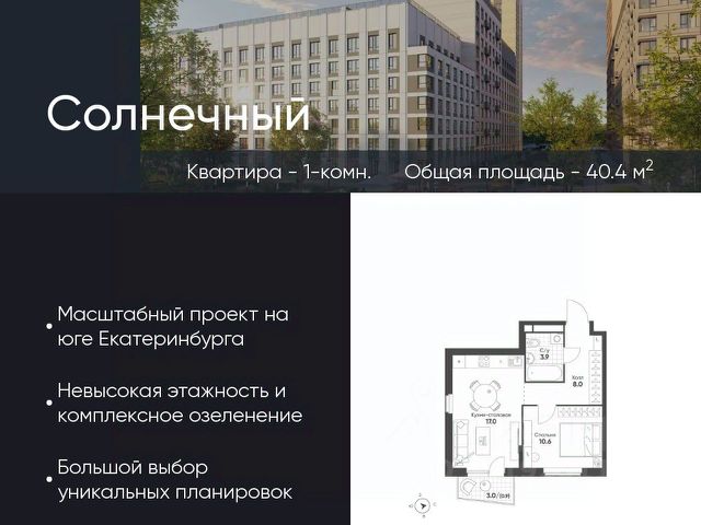 Продается квартира 115, по адресу Свердловская область, г. Екатеринбург, ул. Чемпионов, корпус Солнечный, блок 11.1 в Солнечный на 10 этаже, с площадью 40.4 м2.