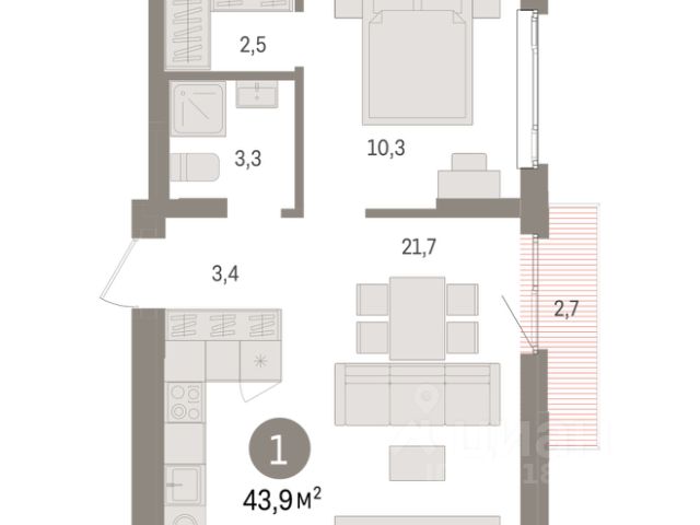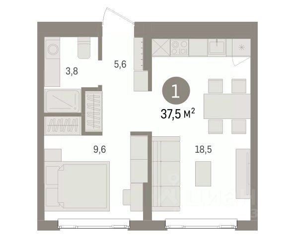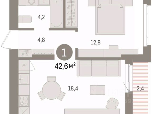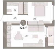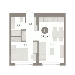 Квартира с кухней-гостиной и одной спальней в квартале "Траектория". Особенности планировки: окна на две стороны, стартовая цена, вид во двор, предчистовая отделка, балкон.