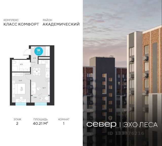Продаётся квартира площадью 32.65 м2 в жилом комплексе "Эхо леса". Квартира находится на 3 этаже дома, который будет введен в эксплуатацию в 1 квартале 2028 года. Жилая площадь квартиры 10.14 м2, площадь просторной кухни — 15.97 м2. Среди особенностей планировки — изолированные комнаты с окнами на одну сторону, 1 совмещённый санузел. Жилой комплекс "Эхо леса" — это: дом в эко-стиле двор с выходом в лесопарк лаконичная архитектура развитая инфраструктура вокруг квартала Срок сдачи — I кв. 2028 Инфраструктура В окружении проекта — вся необходимая инфраструктура: детские сады, школы, спортивный комплекс, продуктовые магазины, аптеки, кофейни, рестораны и салоны красоты. Благоустройство Концепция двора-парка продолжает тему леса. Ландшафт с продуманным всесезонным озеленением дополняют акценты: сухой ручей из камней, столы и навесы из натурального дерева, эко-тропы, фонтан и променад. Для взрослых предусмотрены пешеходные и велодорожки, для детей — игровые площадки для разных возрастов. Архитектура Переменная высота секций создаёт выразительный архитектурный облик. На фасадах — игра контрастных, при этом природных оттенков. Динамики зданию придают текстуры материалов: фактурной штукатурки и клинкерного кирпича. Лобби Интерьер в холле продолжает концепцию квартала и выполнен в эко стиле. В отделке используются элементы природных материалов с изображениями листвы и деревьев. Паркинг Тёплый подземный паркинг организован как единое пространство с собственным дизайном. Кладовые Индивидуальные помещения на техническом этаже — способ сохранить пространство в квартире. Попасть в кладовые можно на лифте. Планировки В продуманных планировках выделены тихие и шумные зоны. Приватные спальни и кабинеты спрятаны от маршрутов домашнего движения, а кухни-гостиные с барной стойкой вместо стены — всегда готовы к семейным праздникам. Из окон квартир открываются живописные виды на лес.