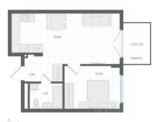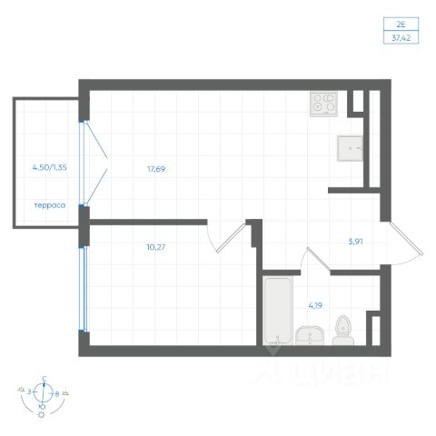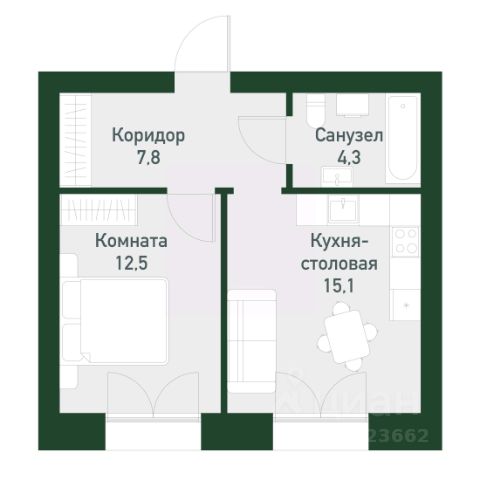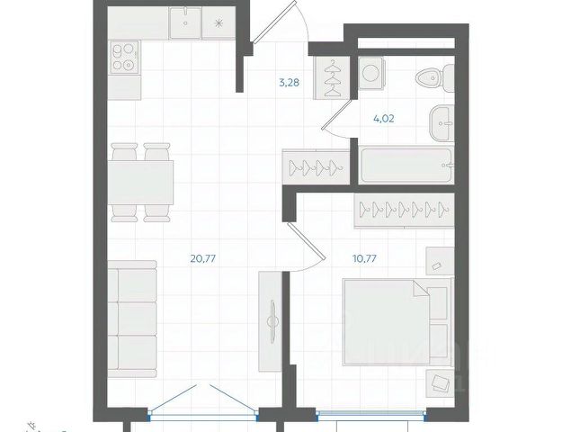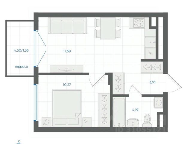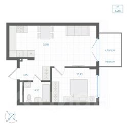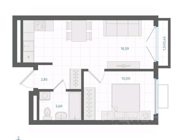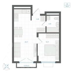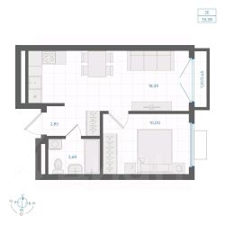 Oбщая площaдь квартиры - 50,4 м2: кухня-гостиная - 19,9 м2, просторная спальня - 18,1 м2, функциональный коридор - 7,9 м2, санузел совмещенный - 4,5 м2. Эргономичная функциональная планировка.