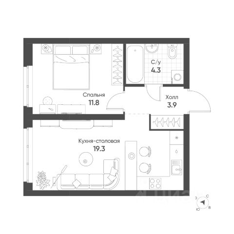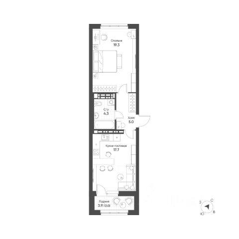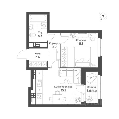 Удачная планировка: просторная кухня-гостиная площадью 14,5 м2 с выходом на лоджию, жилая комната площадью 11,6 м2, совмещенный санузел и вместительный коридор с нишой для хранения !