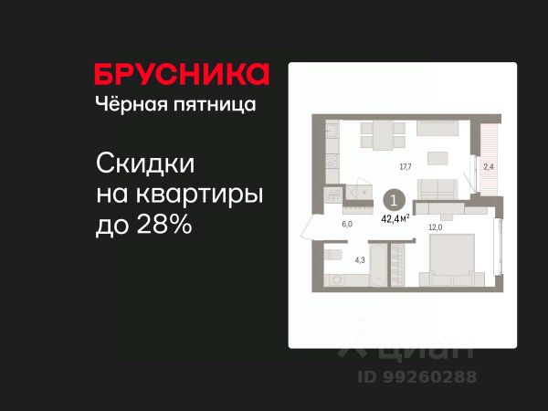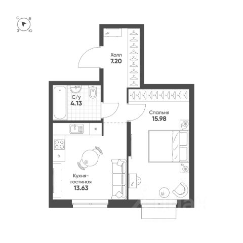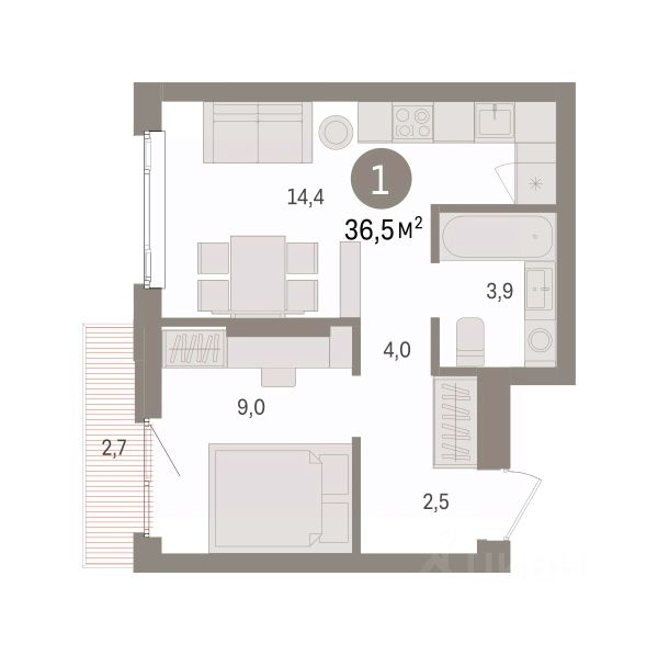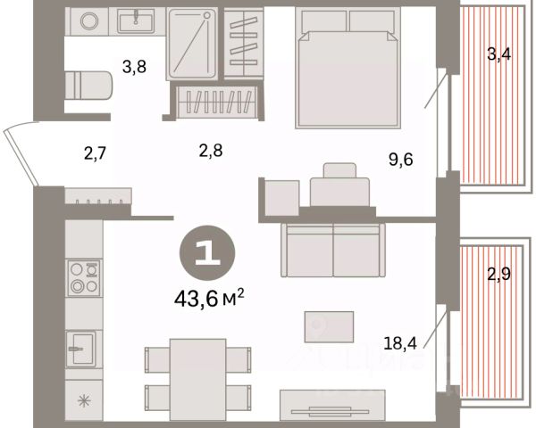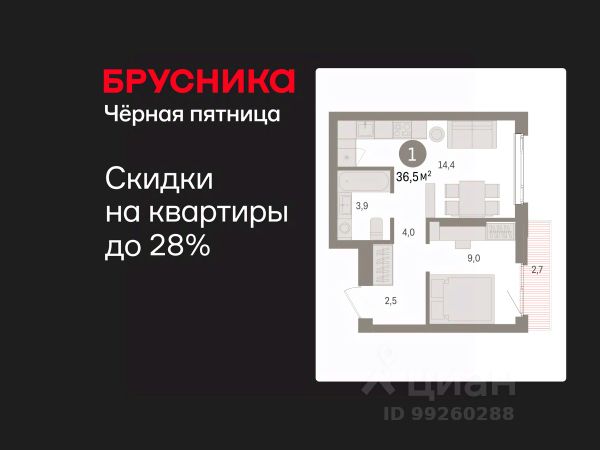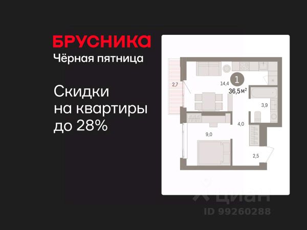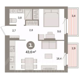 Квартира с кухней-гостиной и одной спальней в квартале "Траектория". Особенности планировки: стартовая цена, предчистовая отделка, балкон.