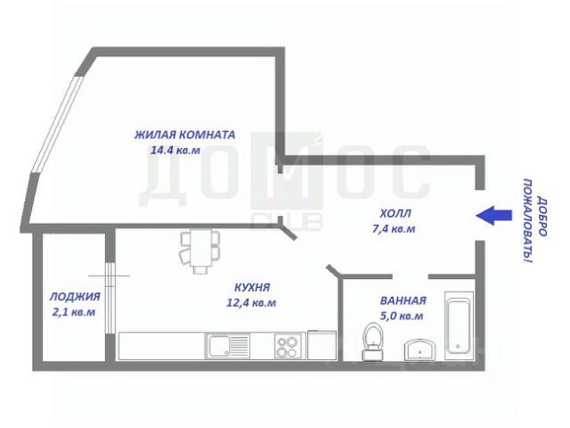 Кухня - гостиная площадью 26 кв.м , спальная 19 кв.м., сан. узел 5 кв.м.
