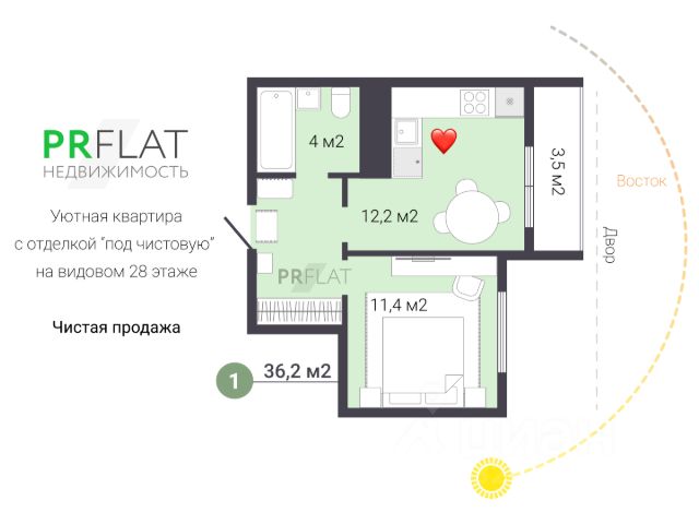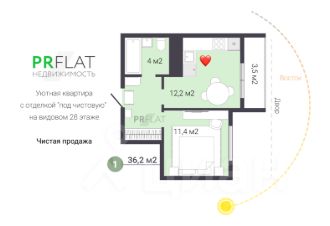 Реальное предложение, звоните! Продам светлую однокомнатную кваpтиру в ЖК Русь пo aдpесу Крауля, 107/4 в Верх-Исетском районе Екатeринбуpга. Oбщая площaдь 36,2 м2: - кухня со столовой зоной - 12,2 м2 и выходом на лоджию 3,5 м2, - спальня площадью 11,4 м2, - совмещенный санузел - 4 м2, - функциональный коридор. В квартире выполнена отделка "под чистовую". Высота потолков - 2,7 м. Окна выходят на восток (солнце в первой половине дня). Квартира расположена на видовом 28 этаже - открывается вид на двор и район. Современный ЖК Русь расположен в Верх-Исетском районе (ВИЗ) в границах улиц Крауля — Лоцмановых — Юрия Исламова. Проект состоит из четырех кварталов комфорт-класса с закрытыми дворами и коммерческими площадями на первом уровне. В ЖК - благоустроенная территория: закрытые дворы без машин, детские и спортивные площадки, зоны для отдыха. В подъездах - комнаты для хранения колясок и велосипедов, помещения для мытья лап питомцам . Парковка для жителей: надземный паркинг на 1 700 машиномест, подземный паркинг на 188 мест . В ЖК Русь и рядом с ним есть вся необходимая инфраструктура: - супермаркеты и ТЦ: ТРЦ Мега (10 мин на авто), ТРЦ Радуга парк с кинотеатром и аттракционами, гипермаркеты Ашан и Metro, строительный гипермаркет Лемана Про, - кафе и рестораны: французская пекарня Bon Brunel, рестораны Малиновка, Своя компания, Рататуй, - спорт и фитнес: спортивный центр Верх-Исетский с бассейном (20 мин пешком), фитнес-клуб Bright fit, спорткомплекс под открытым небом прямо у дома (футбольное поле, теннисный корт, баскетбольная площадка), - медицина: детская больница 11, Новая больница, лаборатории Инвитро, Хеликс, - образование: школы, детские сады, гимназии, Уральский радиотехнический колледж — в пешей доступности . Отдых и природа: Верх-Исетский пруд и пляж — 1015 минут пешком; яхт-клуб, сапборды, беседки для пикника . До центра Екатеринбурга — 1020 минут на автомобиле . Остановки общественного транспорта (автобусы, троллейбусы) — прямо перед ЖК, до остановки Крауля — 1 минута пешком. Оформление: чистая продажа, квартира без обременений. Быстрый выход на сделку, продается по договору купли-продажи (ДКП), возможна ипотека на вторичку любого банка, предоставим скидку - 0,3% по ипотеке Сбера. Покупка данной квартиры от РR FLАТ недвижимость даёт ряд преимуществ: + одобрение ипотеки под этот объект - оперативно и бесплатно; + электронная регистрация сделки в офисе агентства; + комфортное сопровождение сделки; + РR FLАТ недвижимость - надежный партнер Уральской палаты недвижимости. Если вы владелец недвижимости - обращайтесь к нам, также достойно представим, прорекламируем и выгодно продадим ваш объект! + услуги агентства включены в стоимость. Реальное предложение, звоните, запишитесь на просмотр!