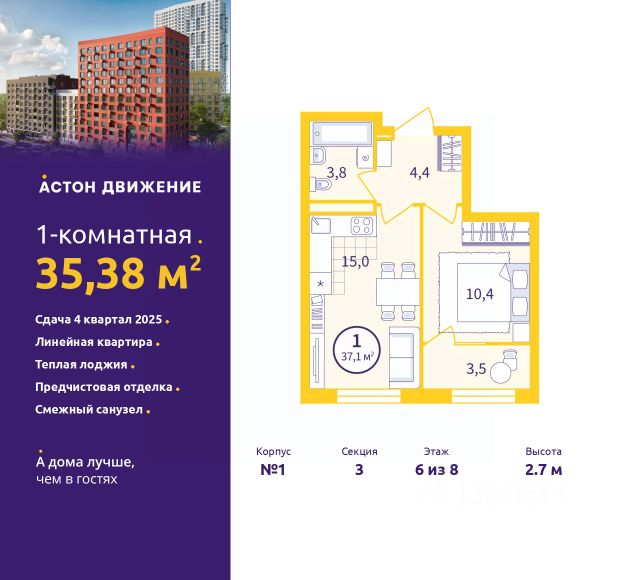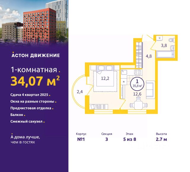 Продается 1-комн. квартира с предчистовой отделкой в ЖК "Астон.Движение" на 4 этаже. Общая площадь: 34.07 кв.м., жилая: 12.2 кв.м., площадь просторной кухни-столовой: 12.6 кв.м. Угловая квартира, идеально подойдет любителям тишины и панорамных видов. В квартире один балкон, один совмещенный санузел. Высота потолков 2.7 м. Отделка white box - золотая середина между чистовой и черновой отделкой. В вашей квартире будут выполнены работы: стяжка пола; выровнены и оштукатурены стены; затерты швы на потолке; электроразводка во всех помещениях; полностью готовая система отопления, водопровод и канализация; установлена входная металлическая сейф-дверь. Дом монолитный, трехподъездный, переменной этажности, от 8 до 12 этажей. Квартира находится в 3-й секции высотой 8 этажей в корпусе 1. На этаже 9 квартир. В подъезде 1 грузовой лифт. Окончание строительства - 4 квартал 2025 года. Оформление сделки по договору долевого участия. Квартал Астон.Движение расположен в развивающейся части Новой Сортировки, на пересечении улицы Пехотинцев и переулка Проходной. Первая очередь 6 домов разной этажности, детский сад и бульвар с прогулочными аллеями в окружении зелени. В архитектуре отдано предпочтение отдельно стоящим секциям, благодаря чему получилась большая вариативность планировок, много видовых квартир с окнами на разные стороны, а постепенный набор высоты домов позволит наполнить солнечным светом каждую квартиру. Первые этажи домов соединяет большая галерея товаров и услуг для жителей и гостей квартала. Двор обустроен для приятного и неспешного движения. Полностью закрытый, без доступа автомобилей, с плавными линиями прогулочных тропинок. Игровые площадки для малышей и ребят постарше находятся на отдалении друг от друга. А взрослым можно разместиться в уютных беседках, на скамейках со столиками в тени деревьев или заняться спортом в уличном воркауте. В холлы организован безопасный безбарьерный доступ: нет риска получить травму или оступиться. Просторные лобби с современной дизайнерской отделкой, ресепшен, кофе-пойнтами и мягкими зонами наполнены светом и воздухом. Чистовая отделка включает: • В комнатах, коридоре и кухне — ламинат 32 класса на звукоизоляционной подложке. В ванной — напольная керамическая плитка; • Стены покрыты обоями и окрашены. В ванной влагостойкая краска нейтрального цвета; • Потолки зашпаклёваны и окрашены; • Установлены глухие межкомнатные двери одной модели; • Сантехника — раковина, унитаз и ванна. #ZwdZf1