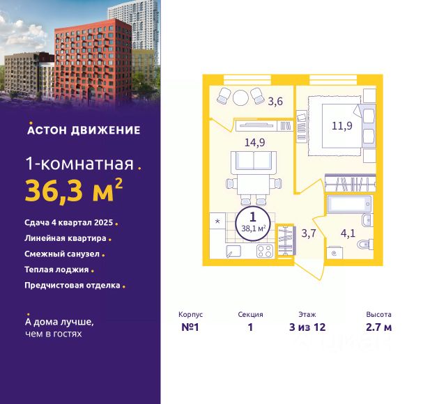 Торопитесь оформить бронирование на этих условиях! Срок акции ограничен! Стоимость квартиры указана со скидкой, ваша экономия составит 631,000 RUB. По всем вопросам обращайтесь в офис продаж, наши менеджеры вам все расскажут! Продается однокомнатная квартира с предчистовой отделкой в ЖК "Астон.Движение" на 3 этаже. Общая площадь: 36.3 кв.м., жилая: 11.9 кв.м., площадь просторной кухни-столовой: 14.9 кв.м. Все окна выходят на одну сторону. В квартире одна лоджия, один совмещенный санузел. Высота потолков 2.7 м. Отделка white box - золотая середина между чистовой и черновой отделкой. В вашей квартире будут выполнены работы: стяжка пола; выровнены и оштукатурены стены; затерты швы на потолке; электроразводка во всех помещениях; полностью готовая система отопления, водопровод и канализация; установлена входная металлическая сейф-дверь. Дом монолитный, трехподъездный, переменной этажности, от 8 до 12 этажей. Квартира находится в 1-й секции высотой 12 этажей в корпусе 1. На этаже 10 квартир. В подъезде 2 грузовых лифта. Окончание строительства - 4 квартал 2025 года. Оформление сделки по договору долевого участия. Квартал Астон.Движение расположен в развивающейся части Новой Сортировки, на пересечении улицы Пехотинцев и переулка Проходной. Первая очередь 6 домов разной этажности, детский сад и бульвар с прогулочными аллеями в окружении зелени. В архитектуре отдано предпочтение отдельно стоящим секциям, благодаря чему получилась большая вариативность планировок, много видовых квартир с окнами на разные стороны, а постепенный набор высоты домов позволит наполнить солнечным светом каждую квартиру. Первые этажи домов соединяет большая галерея товаров и услуг для жителей и гостей квартала. Двор обустроен для приятного и неспешного движения. Полностью закрытый, без доступа автомобилей, с плавными линиями прогулочных тропинок. Игровые площадки для малышей и ребят постарше находятся на отдалении друг от друга. А взрослым можно разместиться в уютных беседках, на скамейках со столиками в тени деревьев или заняться спортом в уличном воркауте. В холлы организован безопасный безбарьерный доступ: нет риска получить травму или оступиться. Просторные лобби с современной дизайнерской отделкой, ресепшен, кофе-пойнтами и мягкими зонами наполнены светом и воздухом. Чистовая отделка включает: • В комнатах, коридоре и кухне — ламинат 32 класса на звукоизоляционной подложке. В ванной — напольная керамическая плитка; • Стены покрыты обоями и окрашены. В ванной влагостойкая краска нейтрального цвета; • Потолки зашпаклёваны и окрашены; • Установлены глухие межкомнатные двери одной модели; • Сантехника — раковина, унитаз и ванна. #26goMl