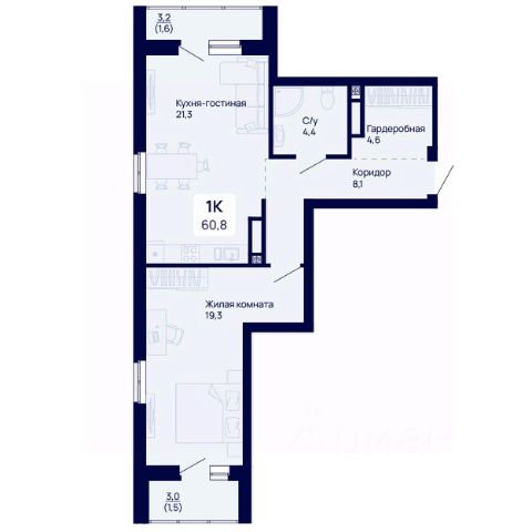 • ✓ Студии, 1-3-комнатные от 38,3 м² до 61,2 м² м²