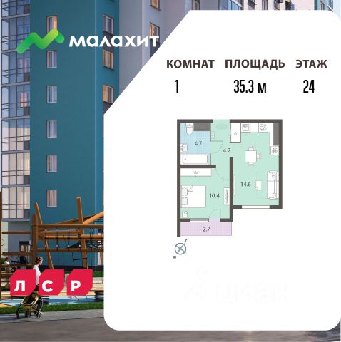 Продается 1-комн. квартира с европланировкой, площадью 35.6 м2 в монолитно-кирпичной новостройке в 8 мин. транспортом от м.Геологическая. Возможен вариант покупки с использованием ипотечных средств, есть рассрочка. Жилая площадь 10.7 м2, кухня 16.9 м2, чистовая отделка. Раздельных санузлов - нет, балконов - нет, лоджий - нет. Квартира располагается на 22 этаже 25-этажного дома в ЖК Малахит. Застройщик - ЛСР, сдача дома - IV квартал 2025 года, высота потолков 2.5 м. Парковка автомобилей - наземная. Инфраструктура: школа, детский сад, детские площадки, спортивные площадки, места для отдыха, супермаркет, коммерческие объекты. Жилой комплекс "Малахит" - новый квартал площадью 25 га в микрорайоне ЖБИ Кировского района Екатеринбурга высотностью 10-26 этажей. Высотность 10-26 этажей Жилой комплекс "Малахит" - находится в микрорайоне ЖБИ Кировского района Екатеринбурга Позвоните и узнайте условия покупки прямо сейчас!