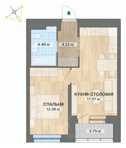 Кухня-гостиная — 17,35 м² с выходом на остеклённую лоджию 2,81 м²