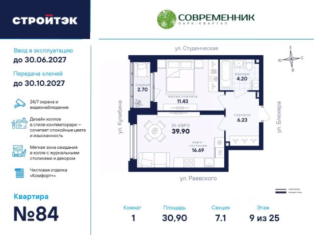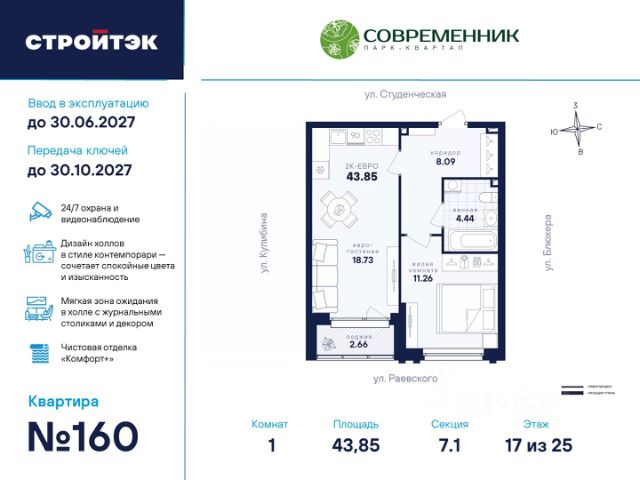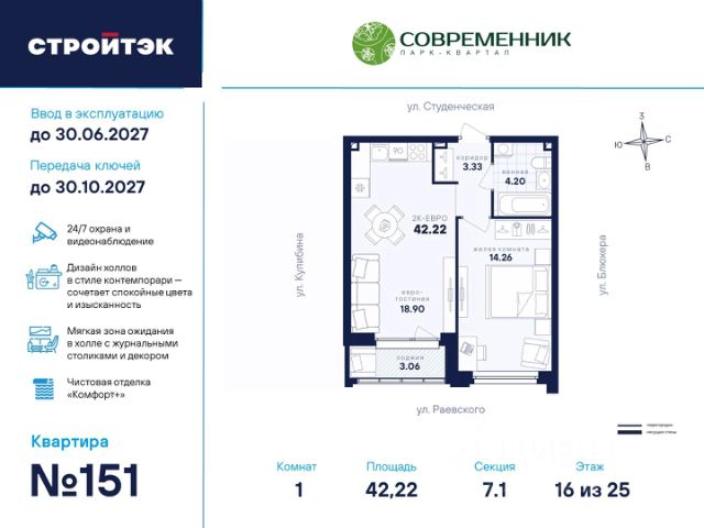 Время жить счастливо Современник — знаковый парк-квартал в интеллигентном районе Втузгородок, откуда недалеко до центра, а вблизи ведущие вузы и театры. Квартал состоит из 8 очередей строительства. Шесть очередей уже сданы и заселены; седьмая строится. В продаже квартиры от застройщика: 1 этап седьмой очереди. Объединяет квартал большой внутренний парк площадью в гектар — богатый прогулочными маршрутами, тенистыми деревьями, пространствами для отдыха, спорта и детских игр. С внешней стороны, у домов седьмой очереди, появится гостевой центр. Проект создавали в KCAP Architects and Planners, архитектурном бюро из Нидерландов, чьи работы украшают ландшафты Гамбурга, Антверпена и других городов Европы. Технологии, продуманное пространство и трендовый облик зданий создают размеренную атмосферу для жизни здесь. Достойное окружение До проспекта Ленина на машине вы доберётесь за 10 минут, а с другой стороны, неподалёку — Шарташский лесопарк с озером Шарташ, которому около миллиона лет. Здесь для вас пляжи, лодочные станции, тропы для бега и кафе. В квартале уже работают супермаркеты, пекарни, салон красоты и не только. Ближние школы, гимназии и университеты помогут расправить крылья новым поколениям, а детские сады станут заботливой средой в начале пути. Кстати, на территории квартала спроектирован муниципальный детский сад на 200 мест. Выходите во двор Гуляйте по зелёным аллеям или устройтесь с книгой в гамаке. Займитесь воркаутом, футболом, баскетболом или пинг-понгом. Проводите семейные праздники под крытым амфитеатром или отправьте детей играть на насыщенный плейхаб. Мы всё предусмотрели. На закрытой территории без машин и посторонних спокойно и безопасно. Видеонаблюдение и освещение добавляют ещё больше уверенности. Впечатляющая доминанта у домов 7 очереди — новый гостевой центр: камерное пространство под навесом-перголой с озеленением и скамейками, чтобы встречать друзей. Ваша зона комфорта Стильное лобби Современника мы выполним в эстетике contemporary: минимализм, сочетание дерева со штукатуркой и тёмным металлом, зеркала, витражи. Обстановка из мягкой мебели, растений и книг. Двери из холла выходят на обе стороны. Внутри — комната для колясок и самокатов. На -1 этаже подземный паркинг с 201 машино-местом, куда легко попасть на лифте прямо с вашего этажа. Здесь же можно приобрести одну из 67 кладовых, чтобы хранить сезонный инвентарь. СТРОЙТЭК возводит 7 очередь в 3 этапа. Дом с привилегиями Первый этап — секция 7.1, башня в 25 этажей. Здесь 246 квартир в 19 уникальных планировках от студий до 3-комнатных, в классических и евро-вариантах. Просторные кухни-гостиные, гардеробные и окна на 2 стороны — лишь часть их плюсов. В Современнике улучшенный стандарт отделки "Комфорт +". Помимо комфортных сантехники и электрики, в него входят оконные стёкла Energy Light, которые помогают сохранять температуру, прочный ламинат 33 класса и устойчивые к многократной покраске виниловые обои. Белые межкомнатные двери и плинтусы подчеркнут любую цветовую гамму. 1-комнатная квартира 1-комнатных квартир в Современник в Екатеринбурге.