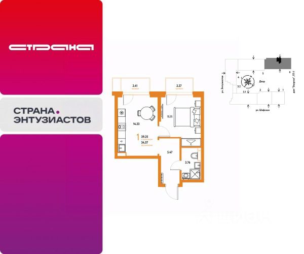 Новая квартира в ЖК "Страна.Энтузиастов" напрямую от федерального застройщика "Страна Девелопмент". Продается 1комнатная квартира на 5 этаже от застройщика Страна Девелопмент. Площадь квартиры 37,46 кв. м. ЖК "Страна.Энтузиастов" Жилой комплекс "Страна.Энтузиастов" — это уютный квартал на севере Екатеринбурга, в центре Эльмаша. Здесь органично соединяются природа и умные технологии. Главной точкой притяжения станет "зелёная" городская гостиная, которая объединит жителей района. А значимой социальной особенностью проекта выступит муниципальный детсад на 100 мест. Преимущества • Городская гостиная для отдыха жителей и гостей — мы вдохновились энергией народной стройки и огромным желанием сделать свой дом лучше и уютнее. Ведь в середине ХХ века на Эльмаше кипела заводская жизнь, лился металл, инженеры и рабочие. • У каждого дома свой приватный двор окружен "зеленью", которая будет цвести весь год. Двор мы разделили на несколько зон: для детей младшего и среднего возраста, релакс пространство с гамаками и подвесными креслами, спортивная зона с воркаут и настольным теннисом. • На первых этажах находятся торговые и офисные помещения. В них располагаются полезные сервисы для жителей: рестораны, магазины, пекарни, кофейни, аптеки, салоны красоты и пункты выдачи заказов. Для каждого помещения спроектирован отдельный вход, витражное остекление и место под вывеску. Отделка Квартиры сдаются с предчистовой отделкой: произведена разводка электричества и отопления, выполнена стяжка пола, стены выровнены "под маяк", установлены розетки, выключатели и радиаторы. Дизайнерская отделка При покупке квартиры в ЖК "Страна.Энтузиастов" можно включить стоимость ремонта в ипотеку. Пять вариантов на выбор: хлопковая нить, серый шторм, белый камень, шалфей, голубой вереск. Способы покупки Сотрудники "Страна Девелопмент" будут сопровождать вас на каждом этапе сделки, помогут получить одобрение по ипотеке или снизить ежемесячный платеж. - ипотека - рассрочка - с использованием материнского капитала -100% оплата наличными