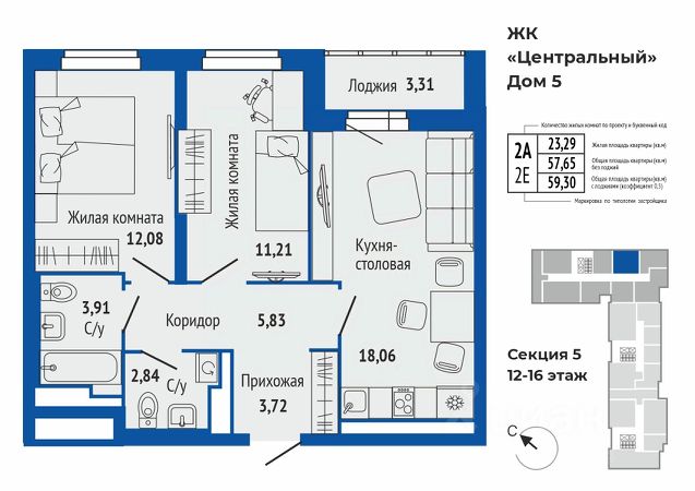Продается 2-к квартира в жилом комплексе Центральный 5