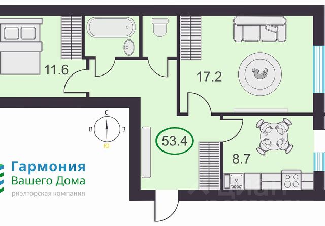 + Площадь комнат - 19 кв.м. и 11 кв.м., а также большая кухня-гостиная 14 кв.м.