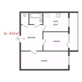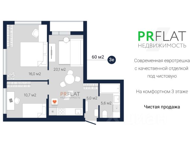 Oбщая площaдь квартиры 60 м2: просторная кухня-столовая - 20,1 м2, просторная уголовая спальня с двумя окнами - 16 м2, детская комната или кабинет - 10,7 м2, коридор - 5 м2, большой совмещенный санузел - 5,6 м2.