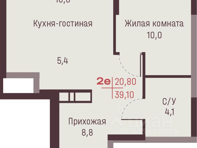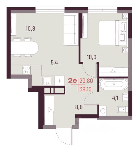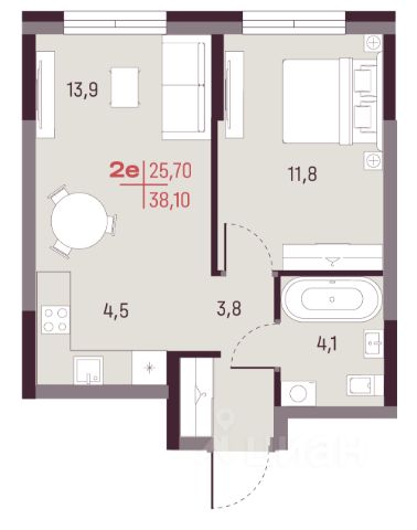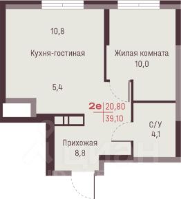 Общая площадь составляет 57,2 квадратных метров, включая две комнаты площадью 10,30 и 10,20 кв. м., кухню-столовую 18,90 кв.м., совмещённый санузел - 4,40 кв. м., санузел - 1,80 кв. м., коридор - 11,60 кв.м; высота потолков достигает 2,72 метра. Внутренняя отделка предусматривает подготовку стен и полов перед финишной отделкой. Из окон открывается вид на променадную улицу.