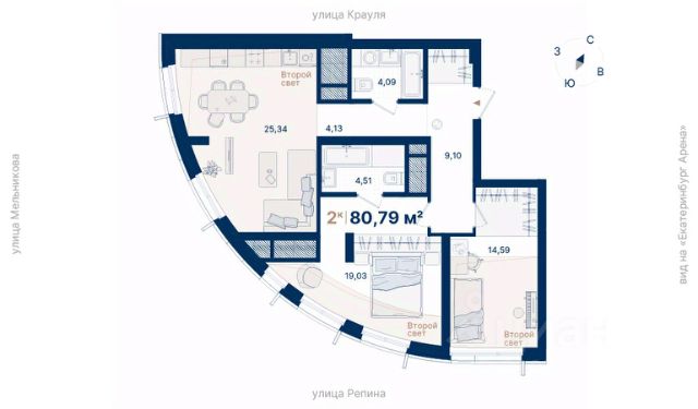 Общая площадь - 88,2 м2: холл и просторная кухня-гостиная со столовой зоной - 45,9 м2, две спальни - 17,4 м2 и 19,9 м2, совмещенный санузел, просторная лоджия 9 м2 с местами для хранения. Окна - в сторону улицы Ключевской.