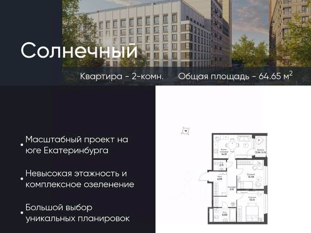 Продается квартира 290, по адресу Свердловская обл., г. Екатеринбург, Чкаловский район, корпус Солнечный, корпус 6.2 в Солнечный на 10 этаже, с площадью 64.65 м2.