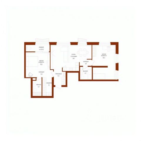 Отделка под чистовую. В санузле — монолитный потолок, на полу — гидроизоляция и стяжка, стены оштукатурены. В одном санузле установлены унитаз и раковина. В остальных помещениях потолок — монолит, на полу — стяжка, стены оштукатурены.