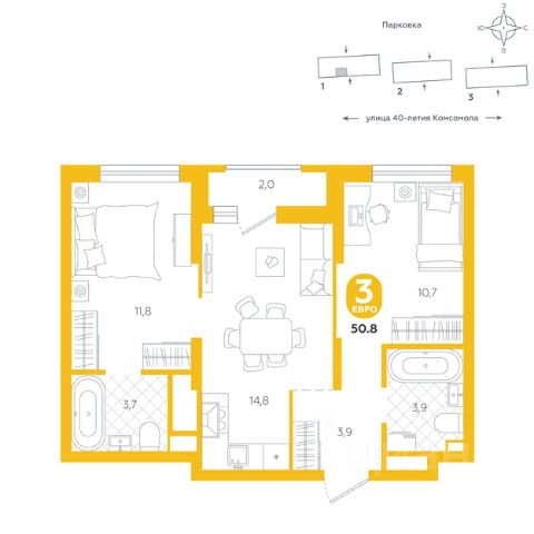 Двухкомнатная квартира с грамотной организацией пространства, которое работает по принципу умного дизайна — выверенные решения для динамичного образа жизни. Здесь удачно сочетаются приватность и современная эргономика: изолированные спальни, уютная кухня с удобной рабочей зоной и практичные системы хранения — эффект упорядоченного простора обеспечен. Квартира располагается в ЖК "Комсомольский" — жилом комплексе комфорт-класса. Здесь вы будете наслаждаться беззаботной жизнью, ведь ваш дом — воплощение практичности, безопасности и надежности. Для удобства предусмотрены колясочные на первых этажах домов, где можно оставить велосипеды и коляски в тепле. За безопасность отвечают система электронных ключей и видеонаблюдение. Еще здесь собственная котельная, поэтому в доме всегда будут горячая вода и оплата счетов только за фактически потребленное тепло. ПРЕИМУЩЕСТВА ЖК На этаже 15 квартир Красивые и функциональные парадные с мягкой и стильной зоной для отдыха, книгообменником, встроенными почтовыми ящиками и нишами для сумок Колясочные с доступом по ключу IP-домофоны Тихие лифты с плавным ходом О ПРОЕКТЕ ЖК "Комсомольский" строится в спокойном Кировском районе Екатеринбурга в границах улиц Сыромолотова — Рассветная — 40-лет Комсомола. Комплекс состоит из трех домов переменной этажности, которые выделяются динамичными линиями, выразительными фасадами и стильными лоджиями. ЛОКАЦИЯ Всё, что необходимо для повседневной жизни, находится недалеко от дома: школы, детские сады, продуктовые магазины, фитнес-клубы. Дорога до центра города на машине займет всего 10 минут — достаточно повернуть с улицы 40-летия Комсомола на улицу Владимира Высоцкого. Рядом с этим перекрестком начинается "Тропа здоровья" — большой терренкур вдоль "Каменных палаток". 10 мин до центра 3-4 минуты до школы No 82, гимназии No 176 4-5 минут до детских садов No 208, No 583, 266 20 мин до Свердловского областного медицинского колледжа и Центральной городской больницы No 7 В рамках стратегического развития района на первых этажах домов появятся коммерческие помещения, в которых откроются магазины и кафе. Следует учесть, что к 2030 году в Кировском районе планируется формирование регионального рекреационно-оздоровительного кластера, строительство ветки метро, расширение и модернизация старых промышленных зон социальной и бизнес-инфраструктуры, что приведет к созданию комфортной среды для жизни. Кроме того, в стратегию входит развитие Шарташского лесного парка как центра регионального и международного туризма. СПОСОБЫ ПОКУПКИ Ипотека: подберем выгодные условия в нескольких банках, чтобы вы могли выбрать лучшее Материнской капитал: можно использовать в качестве первоначального взноса Рассрочка: платите частями без % Сертификаты: позволяют оплатить часть стоимости квартиры О КОМПАНИИ "Паритет Девелопмент" — это современный и ответственный подход к реализации проектов в сфере жилищного строительства. Компания формирует среду, способную создать новое качество жизн
