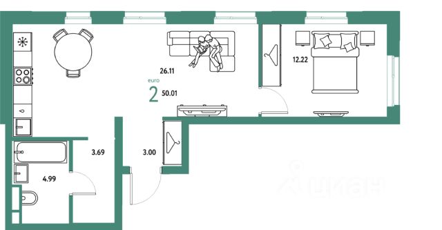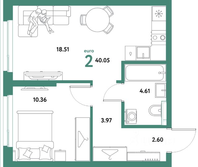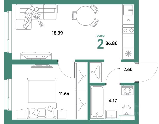* Удобная планировка: кухня-гостиная 15,3 кв.м и комната 10,2 кв.м.